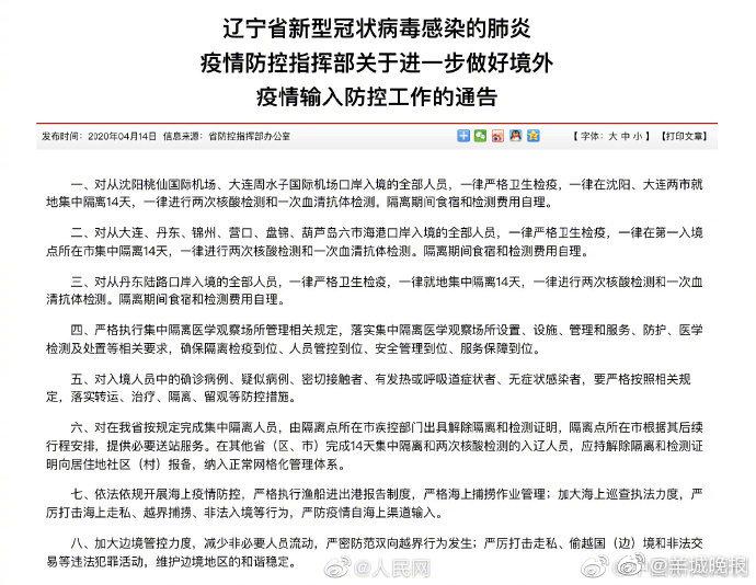 辽宁入境人员一律进行两次核酸检测隔离期间食宿和检测费用自理 热备资讯